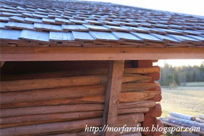 Men 2014 var det dags att börja lägga om taket på den lilla rökbastun. Först flyttades hässj´störarna undan än en gång. Första gången var när syllstockarna skulle bytas. Anordningen som håller störarna på plats under vindskivan vilar på nedersta timmerstocken.